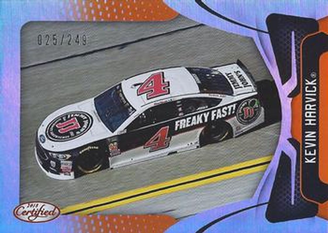 The Kevin Harvick 2018 Certified NASCAR #93 Orange /249 card is 1 of 102 Kevin Harvick's card variations in the 2018 Certified NASCAR set being tracked by Sports Card Investor, including #8 Base /149, #93 Base /149, #8 Orange /249, #8 Mirror Gold /25, and #93 Mirror Gold /25.