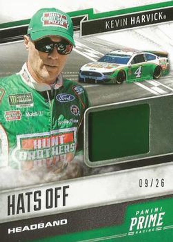 The Kevin Harvick 2019 Prime NASCAR #HO-KH1 Hats Off Headband /36 card is 1 of 125 Kevin Harvick's card variations in the 2019 Prime NASCAR set being tracked by Sports Card Investor, including #71 Base /50, #38 Base /50, #4 Base /50, #4 Black /10, and #38 Black /10.