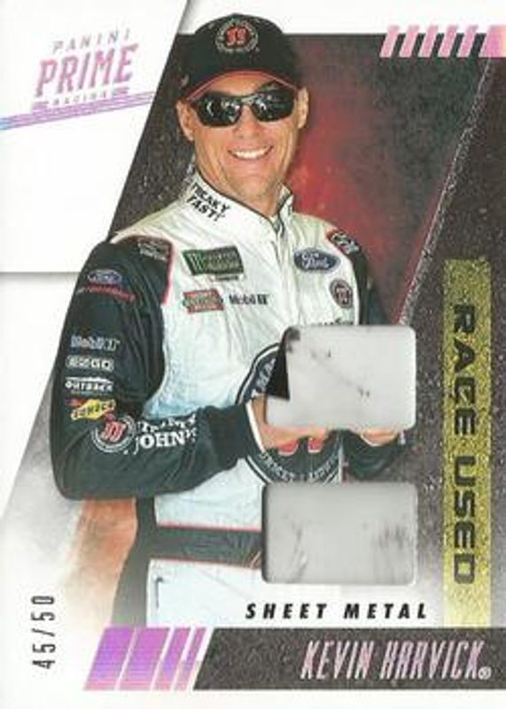 The Kevin Harvick 2019 Prime NASCAR #RUD-KH Race Used Duals Sheet Metal /50 card is 1 of 125 Kevin Harvick's card variations in the 2019 Prime NASCAR set being tracked by Sports Card Investor, including #71 Base /50, #38 Base /50, #4 Base /50, #4 Black /10, and #38 Black /10.