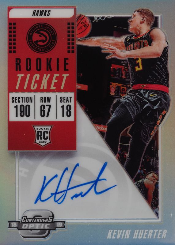 The Kevin Huerter 2018 Contenders Optic #117 Rookie Ticket Auto (Black Jersey) card in Raw condition has not changed in price in the last 30 days and was last sold for $6.41 .