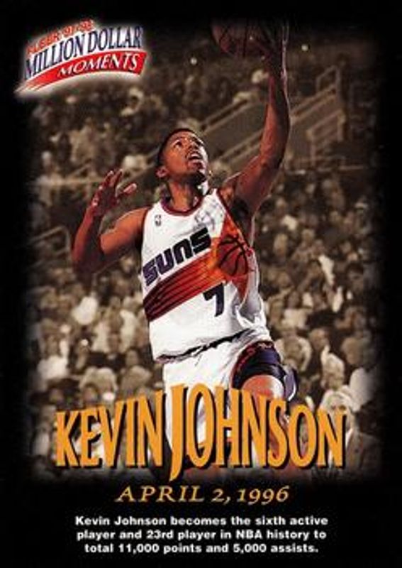 The Kevin Johnson 1997 Fleer #38 Million Dollar Moments card is 1 of 6 Kevin Johnson's card variations in the 1997 Fleer set being tracked by Sports Card Investor, including Base, Crystal, Tiffany, Decade of Excellence, and Decade of Excellence - Rare Traditions.