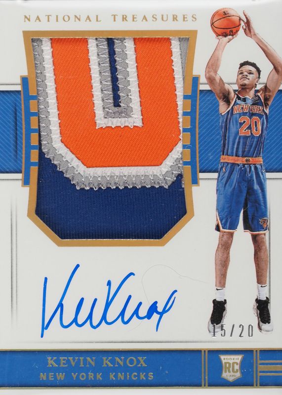 This card is 1 of 8 Kevin Knox's card variations in the 2018 National Treasures set being tracked by Sports Card Investor, including Rookie Patch Auto /99, Rookie Patch Auto - Gold /10, Rookie Patch Auto - Emerald /5, Rookie Patch Auto - Blue FOTL /3, and Rookie Patch Auto - Logoman /1.