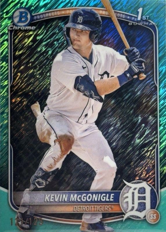The Kevin McGonigle 2025 Bowman #BCP-79 Chrome Prospects - Aqua Shimmer Refractor /125 (1st) card in Raw condition has moved up $22.00 (+44.0%) in the last 30 days and was last sold for $72.00 .