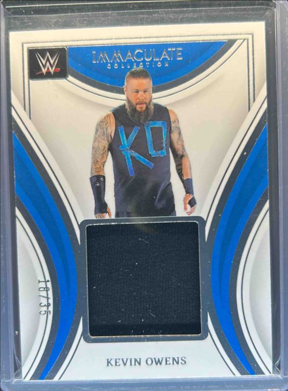 The Kevin Owens 2023 Immaculate #RM-KWN Remarkable Memorabilia /35 card is 1 of 41 Kevin Owens' card variations in the 2023 Immaculate set being tracked by Sports Card Investor, including Base /75, Red /35, Gold /10, Green /5, and Platinum /1.