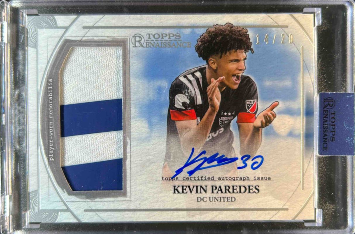 The Kevin Paredes 2022 Topps Renaissance MLS Major League Soccer #AR-KP1 Autographed Relics /20 card is 1 of 21 Kevin Paredes' card variations in the 2022 Topps Renaissance MLS Major League Soccer set being tracked by Sports Card Investor, including #AR-KP3 Autographed Relics /20, #AR-KP2 Autographed Relics /20, #EA-KP1 Renaissance Engravement Autographs /20, #EA-KP3 Renaissance Engravement Autographs /20, and #EA-KP2 Renaissance Engravement Autographs /20.
