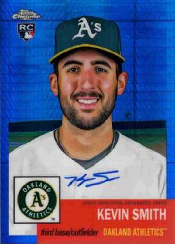 The Kevin Smith 2022 Topps Chrome Platinum Anniversary #CPA-KS Autographs - Blue Prism Refractor /99 Rookie card is 1 of 45 Kevin Smith's card variations in the 2022 Topps Chrome Platinum Anniversary set being tracked by Sports Card Investor, including Base, Black & White Mini Diamond Refractor, Blue Prism Refractor, Gold Prism Refractor, and Prism Refractor.
