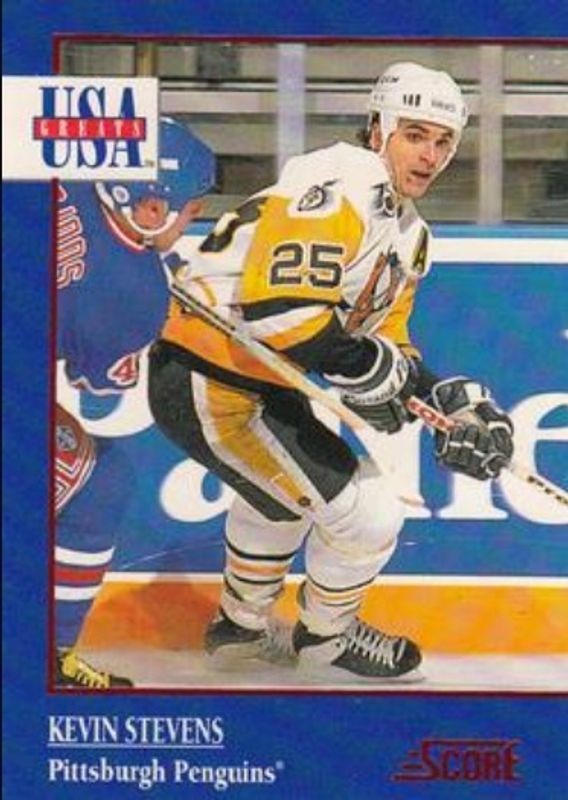 The Kevin Stevens 1992 Score #10 USA Greats card is 1 of 4 Kevin Stevens' card variations in the 1992 Score set being tracked by Sports Card Investor, including #25 Base, #492 Base, and #25 Samples.