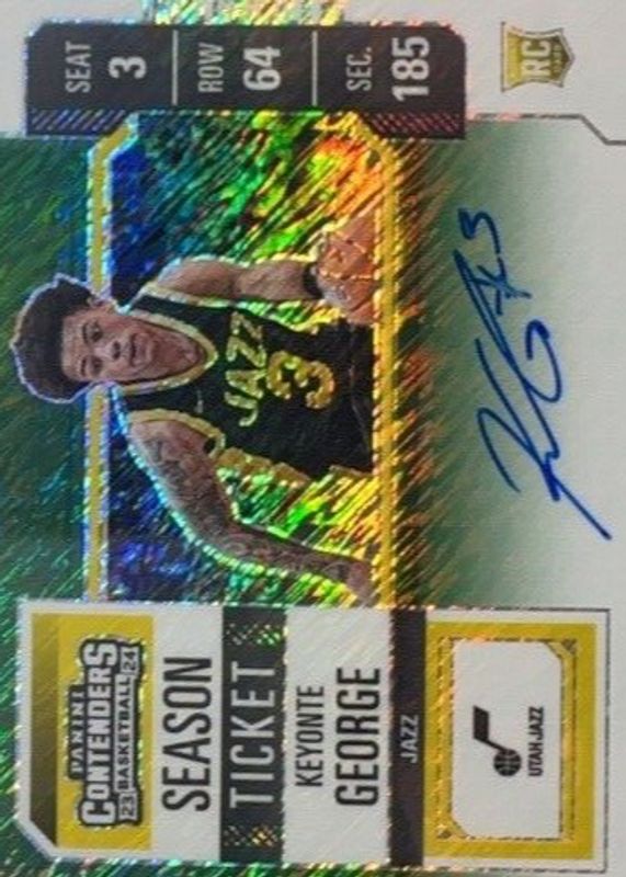 The Keyonte George 2023 Contenders #144 Rookie Ticket Auto Variation - Premium Green Shimmer card in Raw condition has moved down -$4.50 (-2.8%) in the last 30 days and was last sold for $155.00 .