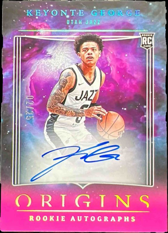 The Keyonte George 2023 Origins #RA-KGU Rookie Autographs - Pink /25 card is 1 of 68 Keyonte George's card variations in the 2023 Origins set being tracked by Sports Card Investor, including Base, Basketballs, Cosmos, Red, and Tessellated.