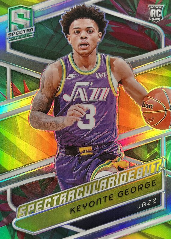 The Keyonte George 2023 Spectra #182 Spectacular Debut - Menagerie Rookie card in Raw condition has not changed in price in the last 30 days and was last sold for $9.50 .