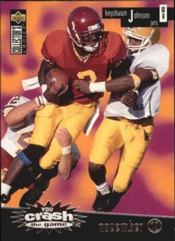 The Keyshawn Johnson 1996 Upper Deck Collector's Choice #CG19b You Crash the Game Silver Rookie card is 1 of 10 Keyshawn Johnson's card variations in the 1996 Upper Deck Collector's Choice set being tracked by Sports Card Investor, including #1 Base, #7 A Cut Above, #CG19b You Crash the Game Gold, #CG19c You Crash the Game Gold, and #CG19a You Crash the Game Gold.