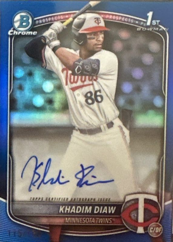 The Khadim Diaw 2025 Bowman #CPA-KDW Chrome Prospect Auto - Blue Refractor /150 (1st) card in Raw condition has not changed in price in the last 30 days and was last sold for $17.50 .