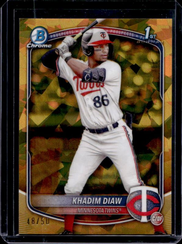 The Khadim Diaw 2025 Bowman Sapphire Edition #BCP-77 Chrome Prospects - Gold Refractor /50 card is 1 of 9 Khadim Diaw's card variations in the 2025 Bowman Sapphire Edition set being tracked by Sports Card Investor, including Chrome Prospects, Chrome Prospects - Green Refractor /99, Chrome Prospects - Yellow Refractor /75, Chrome Prospects - Orange Refractor /25, and Chrome Prospects - Black Refractor /10.
