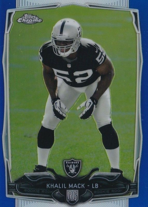 Khalil Mack's Football cards are available in at least 41 sets. Khalil Mack's biggest 7-day price movers are 2014 Topps Chrome #184 Blue Refractor /199, 2019 Absolute #K-KM Kaboom! /(SSP), and 2021 Absolute #K5 Kaboom! /(SSP).