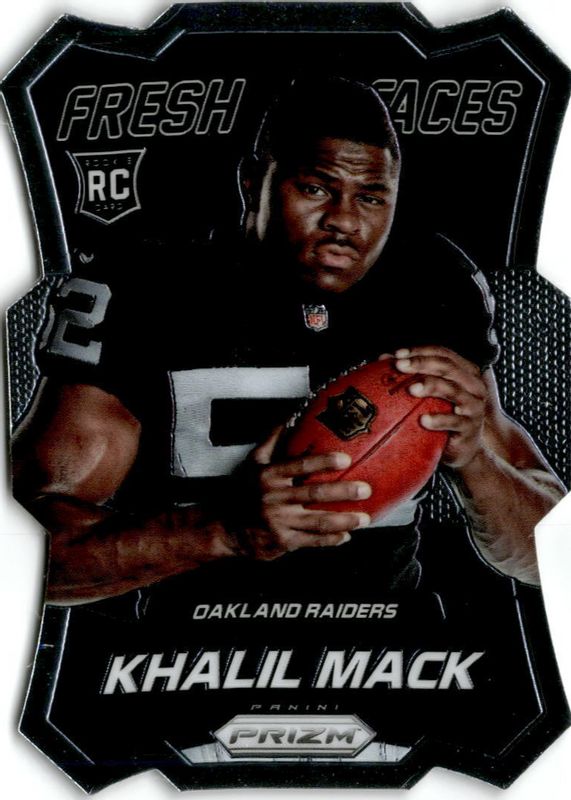 The Khalil Mack 2014 Prizm #FF13 Fresh Faces Rookie card in Raw condition has moved up $3.75 (+300%) in the last 30 days and was last sold for $5.00 .