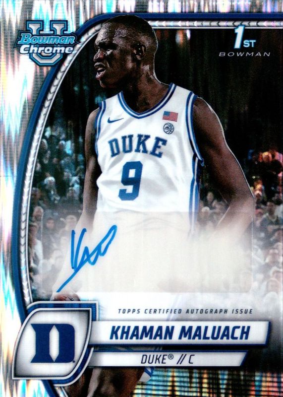 This card is 1 of 46 Khaman Maluach's card variations in the 2024 Bowman Chrome University set being tracked by Sports Card Investor, including Base (1st), Black Wave Refractor (1st), Green Shimmer Refractor (1st), Purple Lava Refractor (1st), and Refractor (1st).