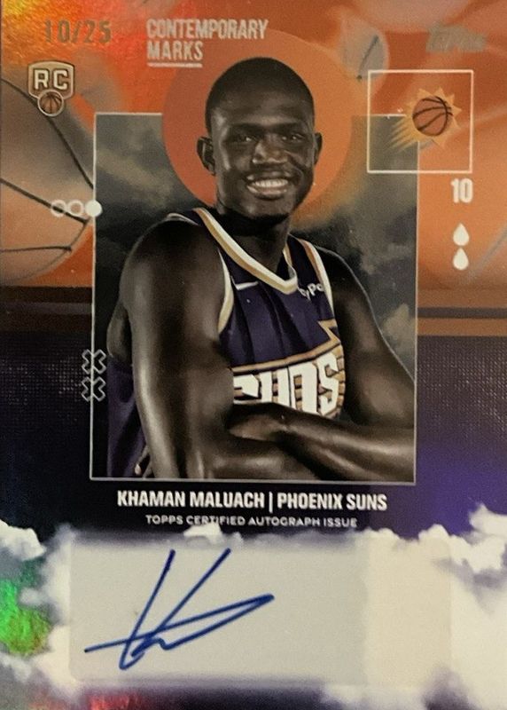 The Khaman Maluach 2025 Topps #CM-KM Contemporary Marks - Orange Rainbow /25 Rookie card in Raw condition has not changed in price in the last 30 days and was last sold for $108.00 .