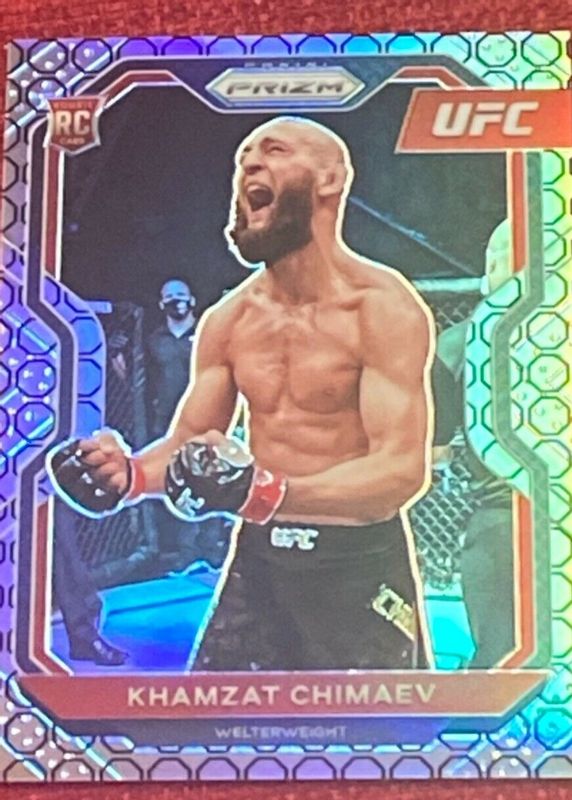 The Khamzat Chimaev 2021 Prizm UFC #7 Octagon /8 Rookie card in Raw condition has not changed in price in the last 30 days and was last sold for $4,000.00 .