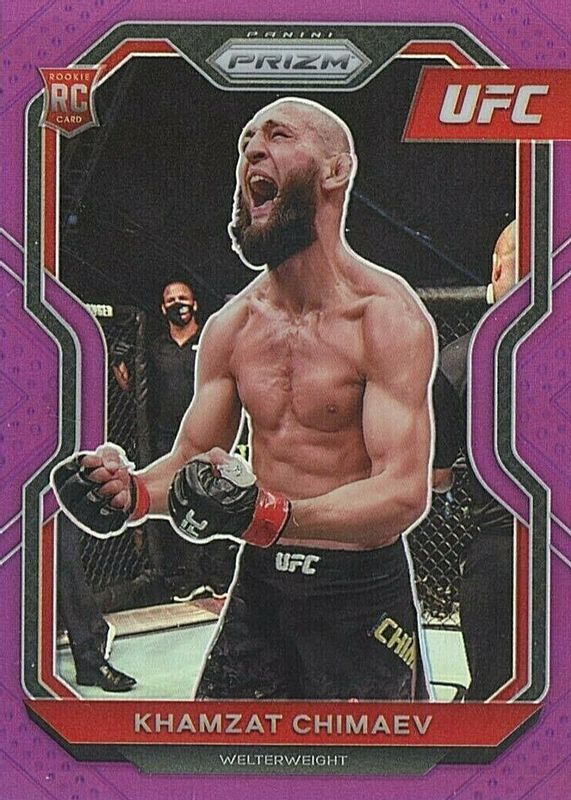 The Khamzat Chimaev 2021 Prizm UFC #7 Purple /149 Rookie card in Raw condition has not changed in price in the last 30 days and was last sold for $167.50 .