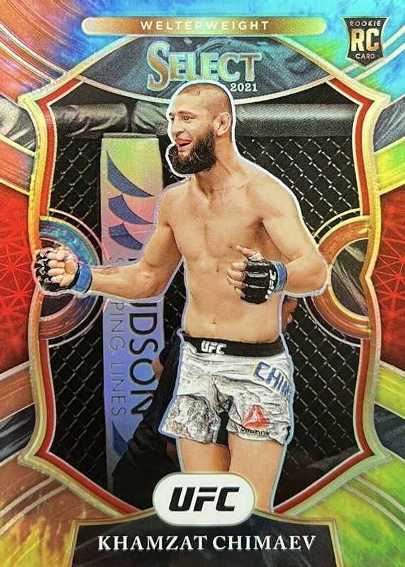 This card is 1 of 50 Khamzat Chimaev's card variations in the 2021 Select UFC set being tracked by Sports Card Investor, including Concourse, Concourse Disco, Concourse Scope, Concourse Silver, and Concourse Tri-Color.