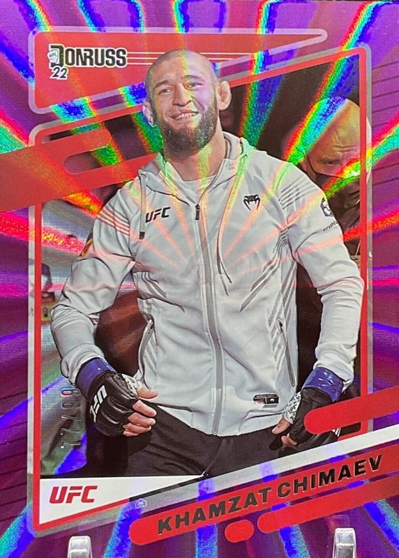 The Khamzat Chimaev 2022 Donruss UFC #14 Holo Purple Laser /99 card in Raw condition has not changed in price in the last 30 days and was last sold for $6.75 .
