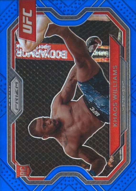 The Khaos Williams 2021 Prizm UFC #179 Blue /199 Rookie card in Raw condition has not changed in price in the last 30 days and was last sold for $1.25 .