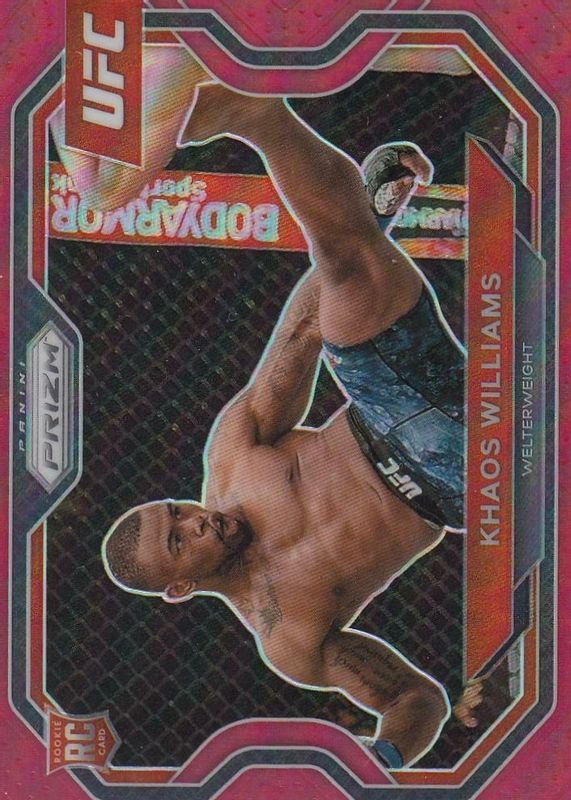 The Khaos Williams 2021 Prizm UFC #179 Red /275 Rookie card in Raw condition has not changed in price in the last 30 days and was last sold for $4.00 .