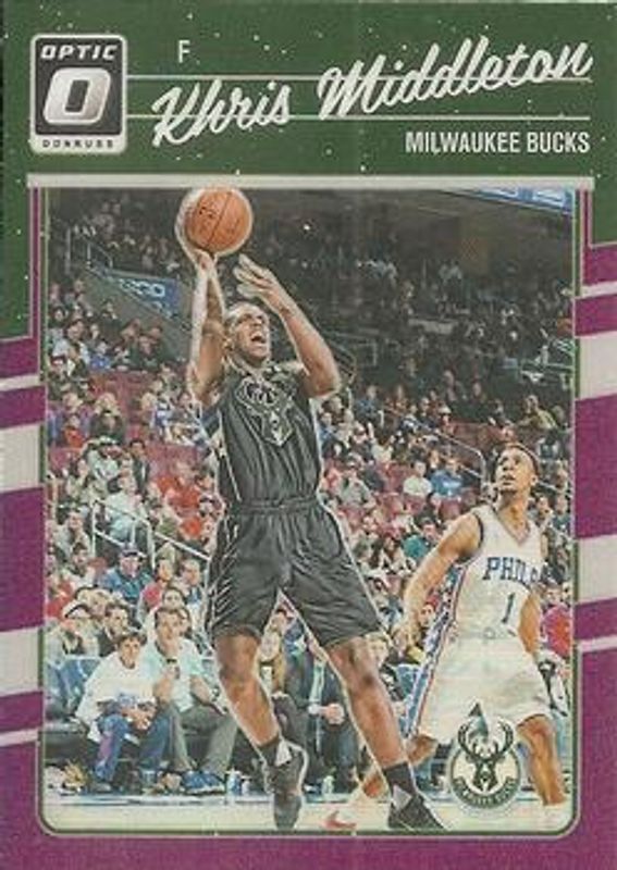 The Khris Middleton 2016 Optic #7 Purple card is 1 of 14 Khris Middleton's card variations in the 2016 Optic set being tracked by Sports Card Investor, including Base, Checkerboard, Holo, Orange /199, and Red /99.