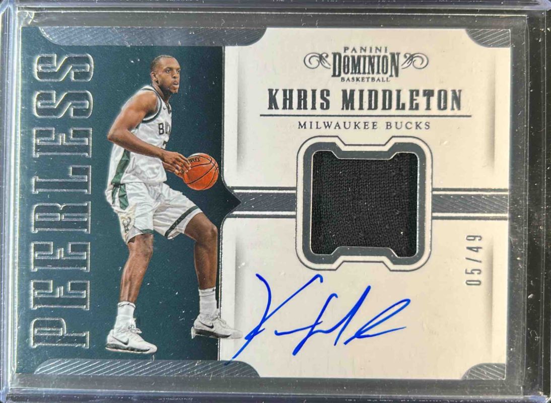 The Khris Middleton 2017 Dominion #PJ-KMD Peerless Jersey Autographs /49 card is 1 of 11 Khris Middleton's card variations in the 2017 Dominion set being tracked by Sports Card Investor, including Rookies Metal /199, Rookies Metal - Gold /10, Platinum /1, Main Exhibit Autographs /49, and Main Exhibit Autographs - Bronze /25.