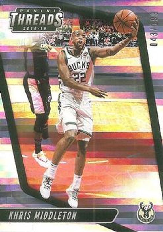 The Khris Middleton 2018 Threads #6 Premium /199 card is 1 of 24 Khris Middleton's card variations in the 2018 Threads set being tracked by Sports Card Investor, including Base, Dazzle, Dazzle Purple /99, Dazzle Pink /75, and Premium Blue /75.