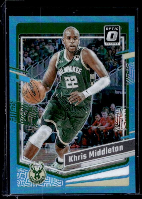 The Khris Middleton 2023 Optic #11 Aqua /249 card is 1 of 55 Khris Middleton's card variations in the 2023 Optic set being tracked by Sports Card Investor, including Base, Blue Velocity, Checkerboard, Choice Red & Green, and Fast Break.