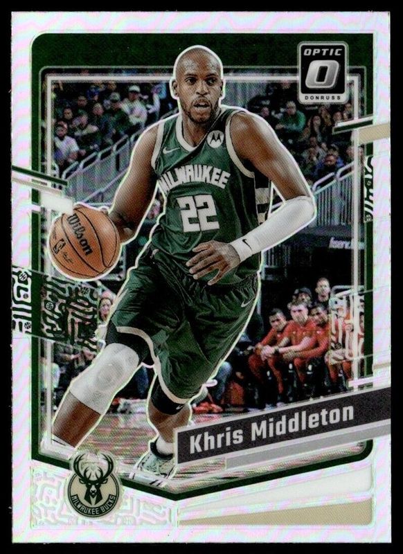 The Khris Middleton 2023 Optic #11 Holo card is 1 of 55 Khris Middleton's card variations in the 2023 Optic set being tracked by Sports Card Investor, including Base, Blue Velocity, Checkerboard, Choice Red & Green, and Fast Break.