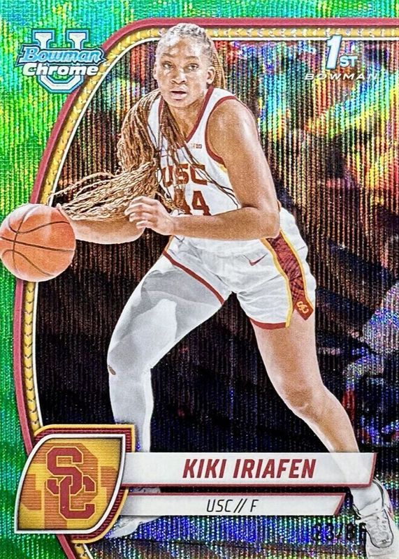 The Kiki Iriafen 2024 Bowman Chrome University #47 Green Wave Refractor /85 (1st) card in Raw condition has not changed in price in the last 30 days and was last sold for $3.33 .