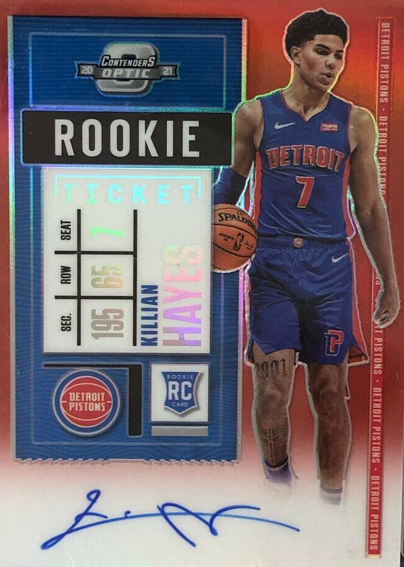 The Killian Hayes 2020 Contenders Optic #117 Rookie Ticket Auto - Red /149 (Blue Jersey) card in Raw condition has not changed in price in the last 30 days and was last sold for $9.99 .