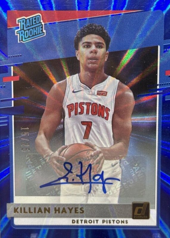 The Killian Hayes 2020 Donruss #204 Rated Rookie Signatures - Holo Blue Laser /25 card in Raw condition has not changed in price in the last 30 days and was last sold for $2.99 .