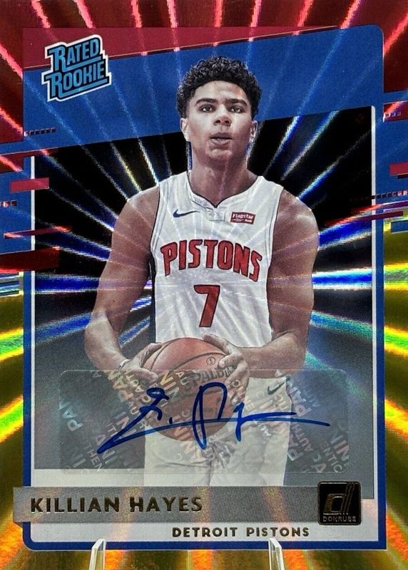 The Killian Hayes 2020 Donruss #204 Rated Rookie Signatures - Holo Red & Gold Laser card in Raw condition has not changed in price in the last 30 days and was last sold for $1.29 .