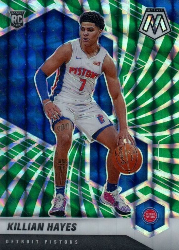 The Killian Hayes 2020 Mosaic #222 FOTL Green Swirl /10 Rookie card in Raw condition has not changed in price in the last 30 days and was last sold for $27.00 .