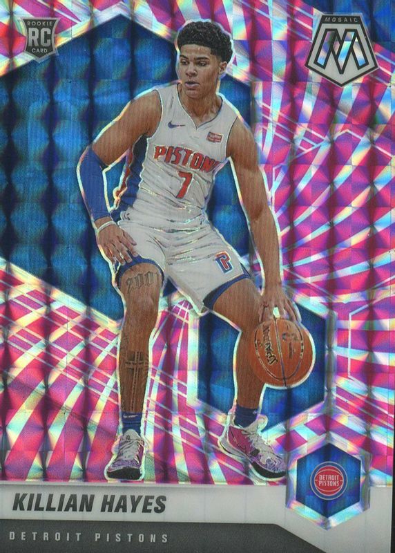 The Killian Hayes 2020 Mosaic #222 FOTL Pink Swirl /11 Rookie card in Raw condition has not changed in price in the last 30 days and was last sold for $8.00 .