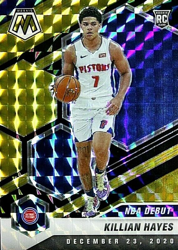 The Killian Hayes 2020 Mosaic #270 NBA Debut - Choice Black & Gold /8 Rookie card in Raw condition has not changed in price in the last 30 days and was last sold for $100.06 .