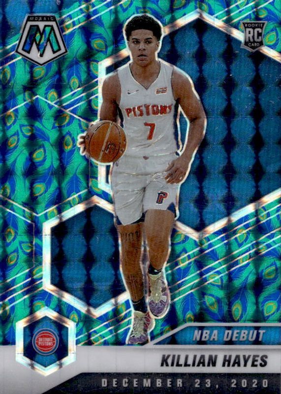 The Killian Hayes 2020 Mosaic #270 NBA Debut - Choice Peacock /(SSP) Rookie card in Raw condition has not changed in price in the last 30 days and was last sold for $56.00 .