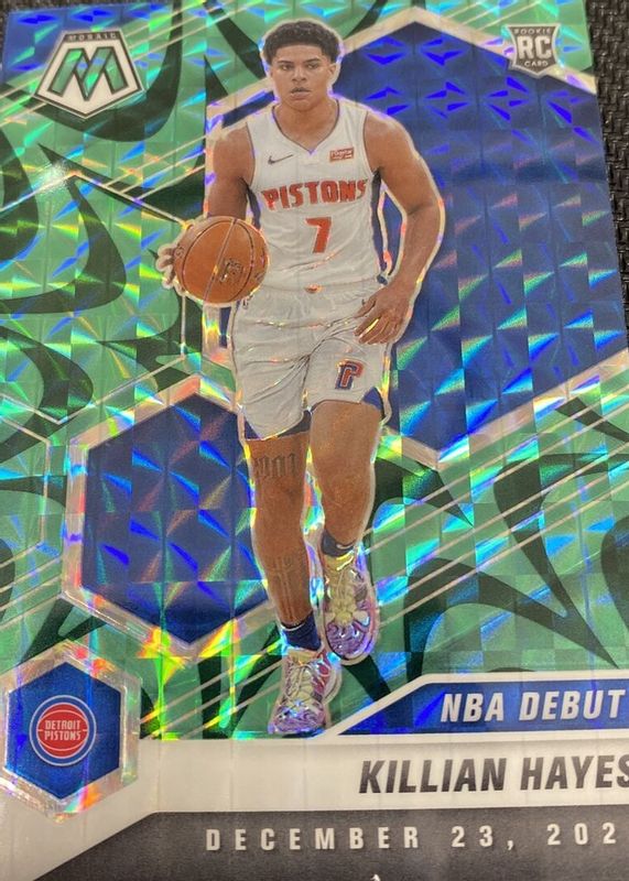 The Killian Hayes 2020 Mosaic #270 NBA Debut - Reactive Green Rookie card in Raw condition has not changed in price in the last 30 days and was last sold for $2.50 .