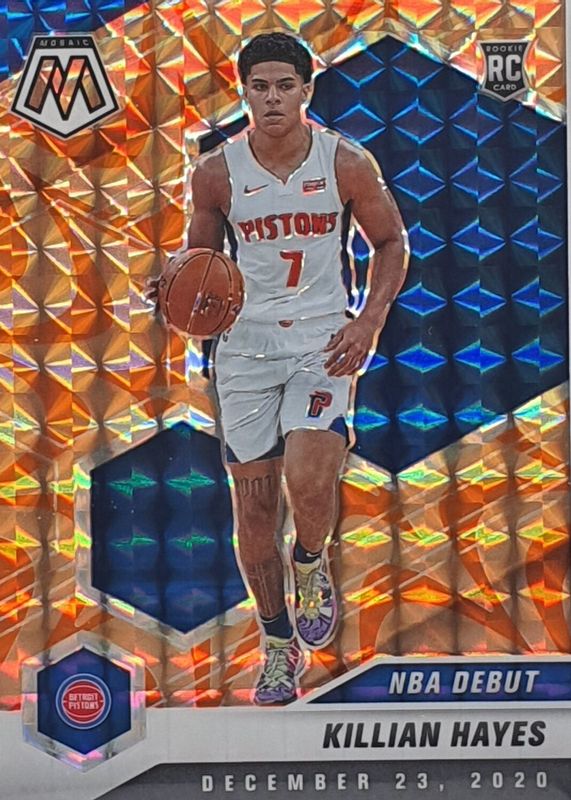 The Killian Hayes 2020 Mosaic #270 NBA Debut - Reactive Orange Rookie card in Raw condition has not changed in price in the last 30 days and was last sold for $1.38 .