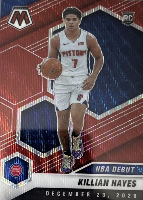 The Killian Hayes 2020 Mosaic #270 NBA Debut - Red Wave Rookie card in Raw condition has not changed in price in the last 30 days and was last sold for $1.00 .