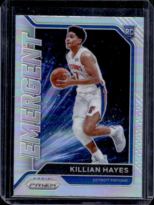 The Killian Hayes 2020 Prizm #7 Emergent - Silver Rookie card is 1 of 77 Killian Hayes' card variations in the 2020 Prizm set being tracked by Sports Card Investor, including #270 Base, #270 Choice Blue Yellow Green, #270 Fast Break, #270b Fast Break, and #270 Green.