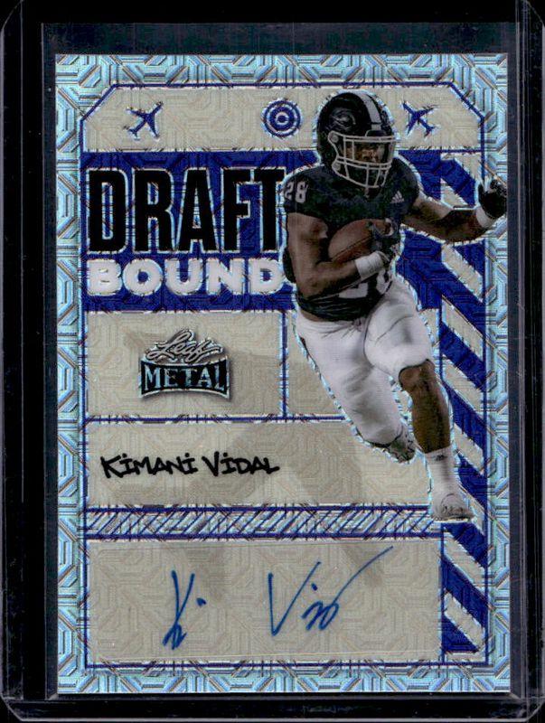 The Kimani Vidal 2024 Leaf Metal #DB-KV1 Draft Bound Autographs - Mojo Purple /7 Rookie card is 1 of 165 Kimani Vidal's card variations in the 2024 Leaf Metal set being tracked by Sports Card Investor, including Autographs Pulsar Sky Pre Production Proofs, Autographs Clear Blue Pre Production Proofs /1, Autographs Clear Earth Pre Production Proofs /1, Autographs Clear Fire Pre Production Proofs /1, and Autographs Clear Pink Pre Production Proofs /1.