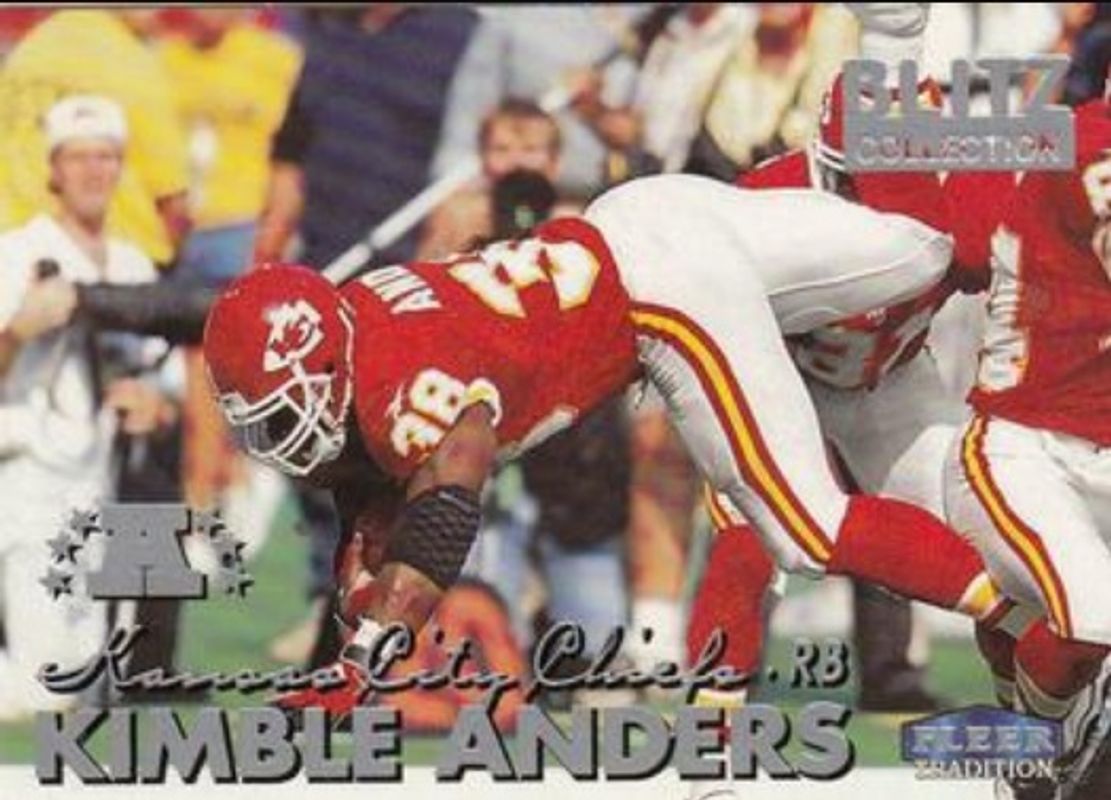The Kimble Anders 1999 Fleer Tradition #56BC Blitz Collection card is 1 of 3 Kimble Anders' card variations in the 1999 Fleer Tradition set being tracked by Sports Card Investor, including Base, and Trophy Collection /20.