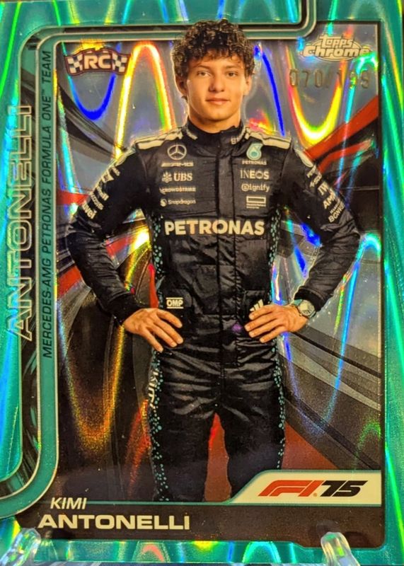 The Kimi Antonelli 2025 Topps Chrome Formula 1 #8 Aqua RayWave Refractor /199 Rookie card in Raw condition has moved up $11.50 (+7.7%) in the last 30 days and was last sold for $161.50 .