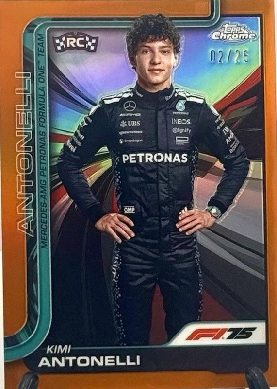 The Kimi Antonelli 2025 Topps Chrome Formula 1 #8 Orange Refractor /25 Rookie card in Raw condition has not changed in price in the last 30 days and was last sold for $750.00 .