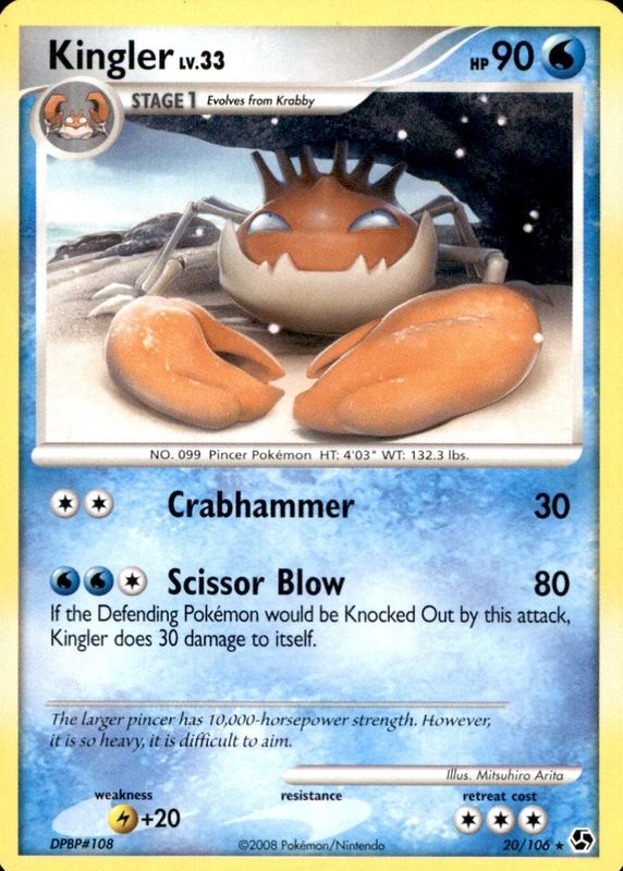 The Kingler 2008 Diamond & Pearl: Great Encounters #020/106 Base card in Raw TCG (Lightly Played) condition has moved down -$0.07 (-2.3%) in the last 30 days and was last sold for $2.92 .