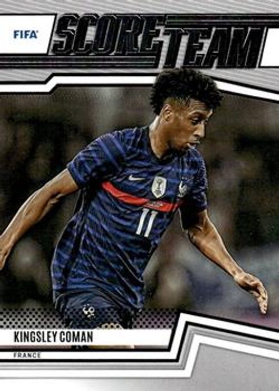 The Kingsley Coman 2022 Score FIFA #13 Score Team card is 1 of 19 Kingsley Coman's card variations in the 2022 Score FIFA set being tracked by Sports Card Investor, including Base, Laser, Swirl, Red Swirl /65, and Blue Laser /60.